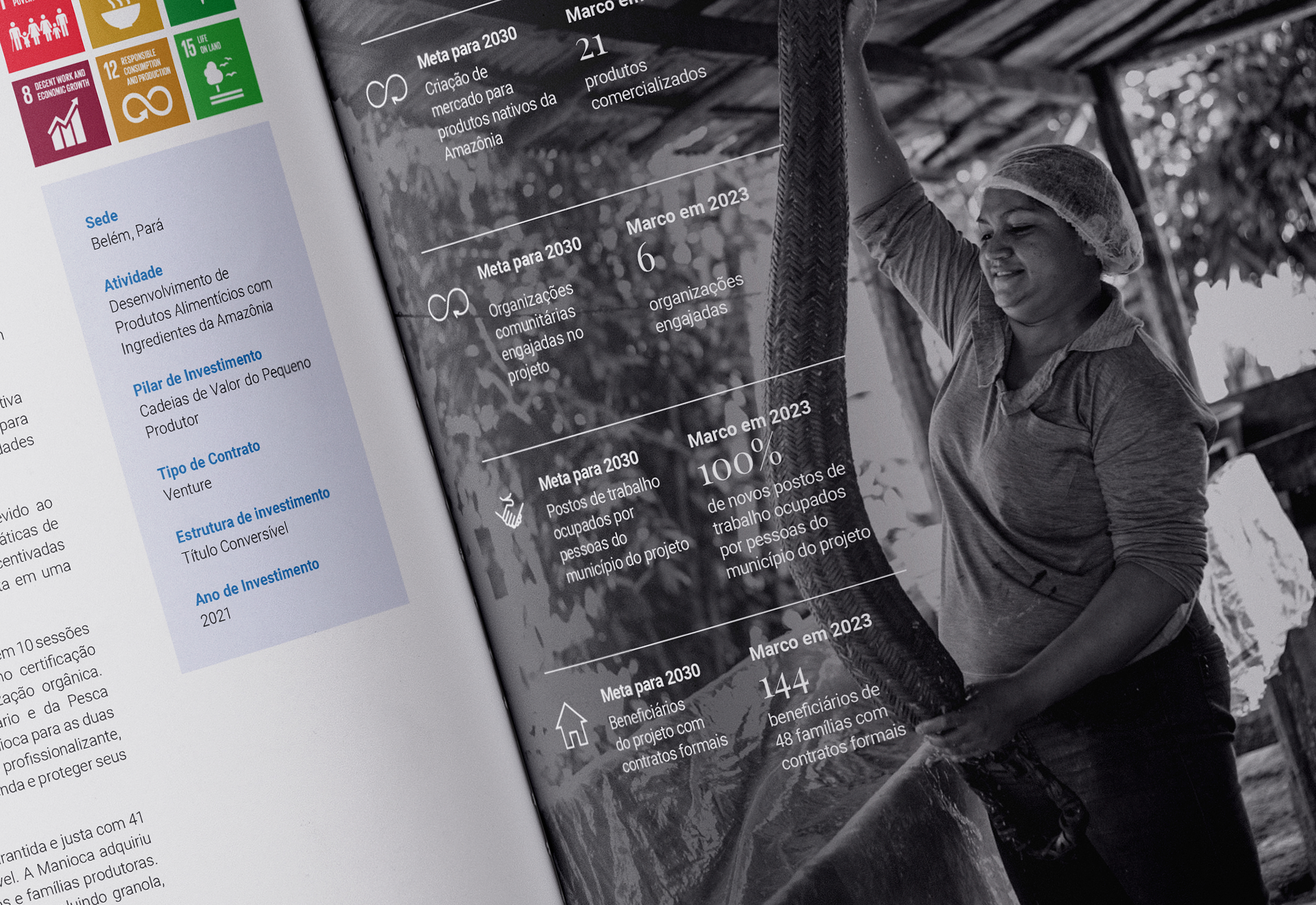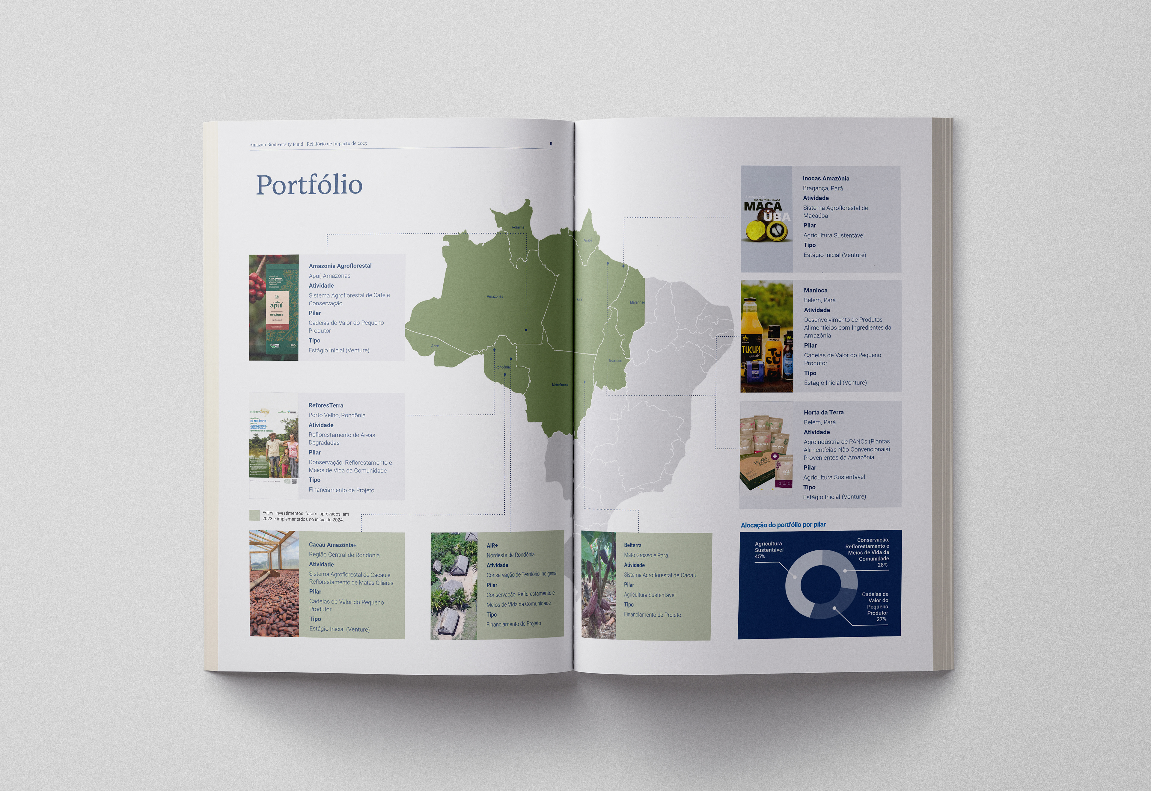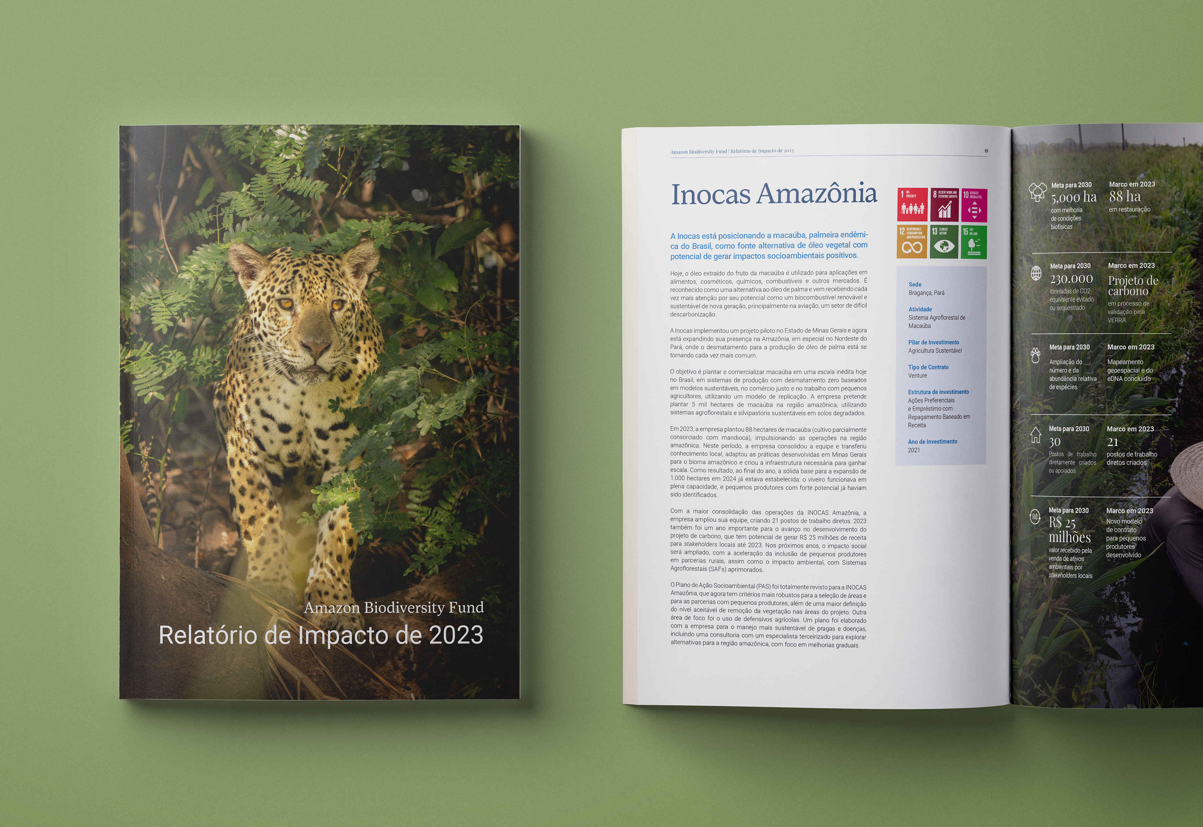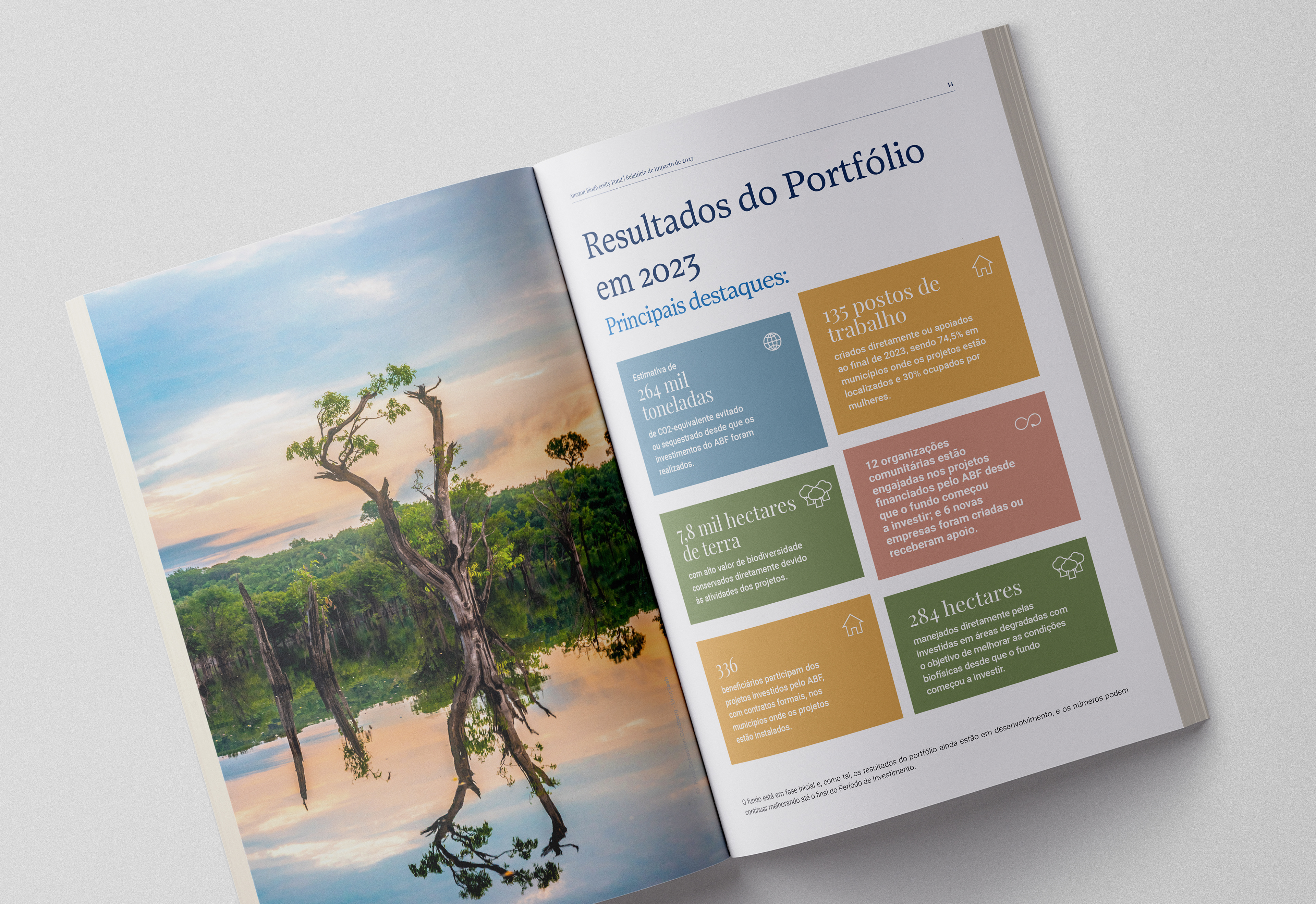 Projeto gráfico e diagramação do "Relatório de impacto da Amazon Biodiversity Fund" de 2023.